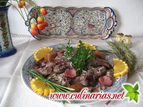 Faça um refogado com a cebola e o azeite e quando estiver a alourar, retire o entrecosto da marinada e ponha a refogar. Junte umas rodelinhas de bom chouriço e quadradinhos de bacon, se gostar. Deixe cozinhar e vá juntando aos poucos a marinada, até ficar com calda suficiente para que o arroz fique malandrinho.
