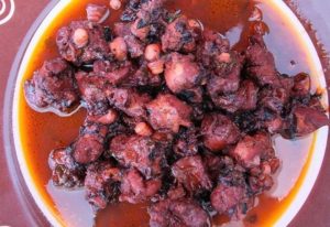 Ligue o forno a 180 graus. Deite as batatas num tabuleiro, espalhe o preparado anterior por cima, regue com mais caldo de cozer o polvo até cobrir as batatas, rectifique os temperos e leve ao forno durante 45 minutos. Junte então o polvo cozido cortado em pedaços, envolva e deixe no forno mais 10 minutos. Retire do forno e sirva decorado a gosto.