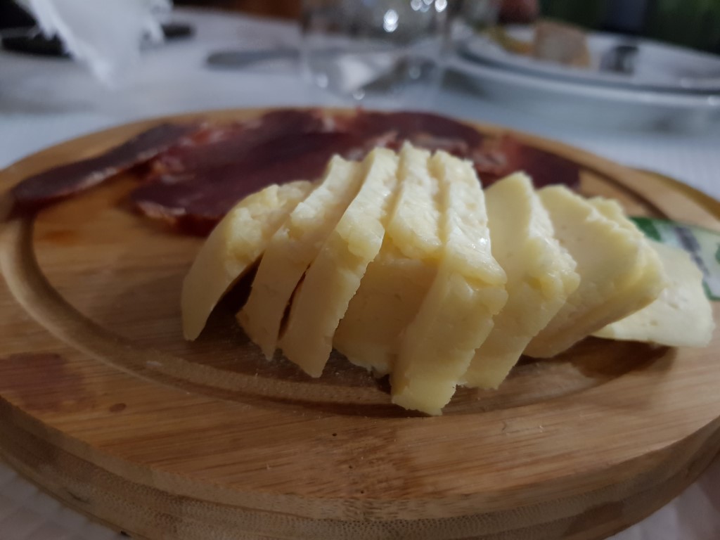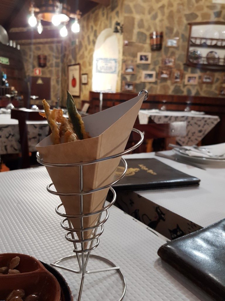 Pedimos um vinho tinto da casa, uma dose de lagartos e uma dose de polvo à lagareiro. Enquanto os nossos pratos estavam a ser confecionados, começamos pelas entradas, um paio do lombo delicioso, um queijo da serra e uns peixinhos da horta, que embora estivessem frios, estavam muito saborosos.