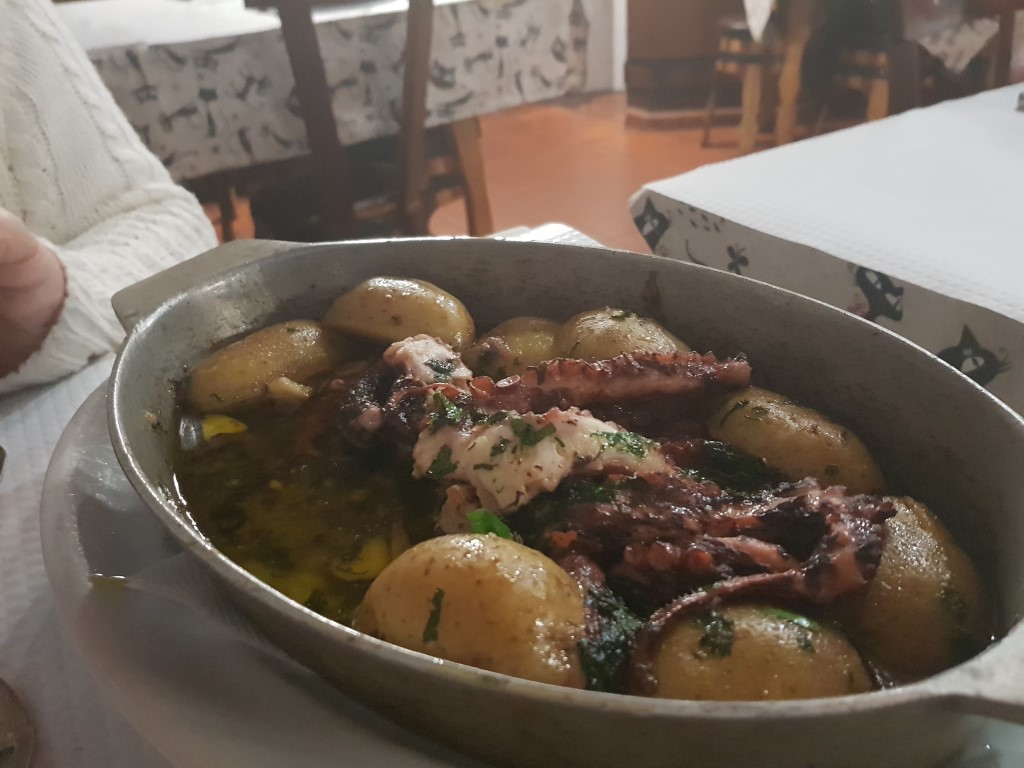 Quase sem dar por ela os nossos pratos estavam prontos, carinhosamente o Sr. Luís pergunta se pode trazer os pratos para a mesa. Os lagartos estavam bons, mas a estrela da companhia foi o polvo à lagareiro, bem regado em azeite, alho e super tenro. Se falarmos em sabor, posso vos dizer sem qualquer sombra de dúvida que temos um claro 11 numa classificação de 0 a 10.