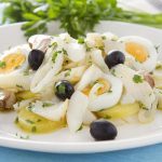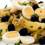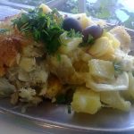 Lascas essas levadas depois ao forno em azeite finíssimo, com batatas, alho, cebola e na hora de servir, azeitonas pretas, salsa e ovo cozido.