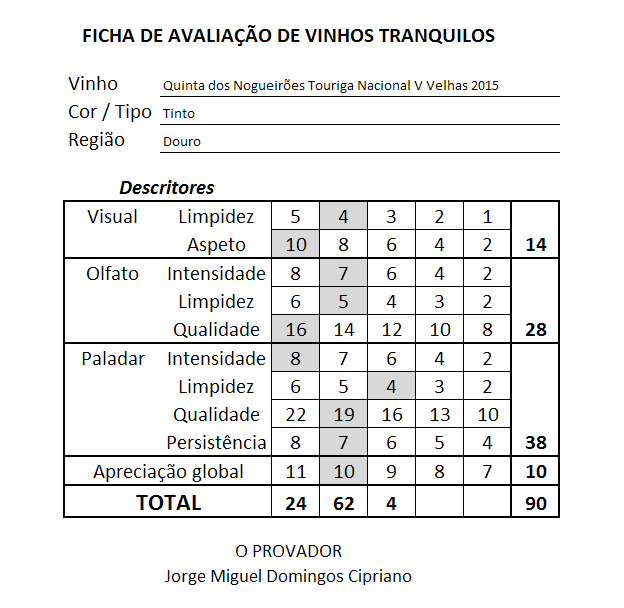 Foi provado o vinho Quinta dos Nogueirões Touriga Nacional Coleção da Família Vinhas Velhas Tinto 2015, produzido na Região Demarcada do Douro, zona de São João da Pesqueira.