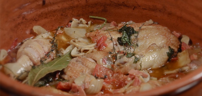 6º Baixar o lume e juntar o frango, a salsa e o tomilho.