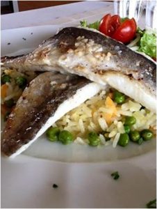 - Espadarte grelhado com banana flanbejada , batatinha e legumes