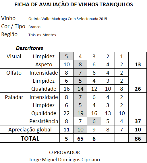 Foi provado o vihno Quinta Valle Madruga Colh Selecionada Branco 2015, da região de Trás-os-Montes, produzido na Sub-Região de Valpaços