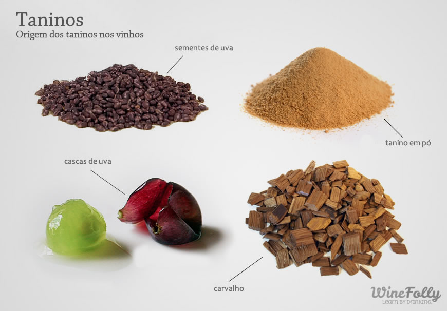 É importante fazer a ressalva de que estamos a falar de vinhos tintos. Os brancos apresentam quantidades muito inferiores de taninos, uma vez que a fermentação se dá, via de regra, sem a presença das partes sólidas das uvas, de onde se extraem a maior parte dos taninos.